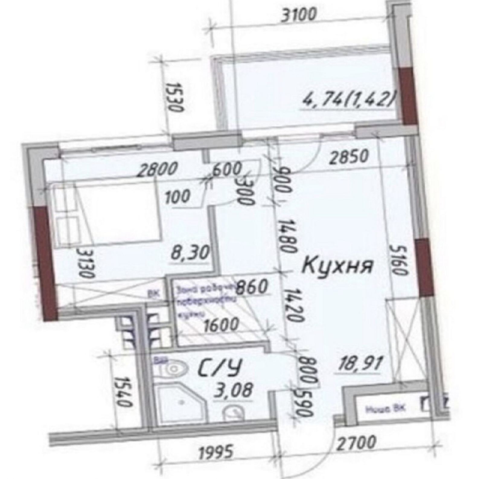 Апартаменти загальною площею 32,8 м2 розпланована на окрему кімнату і кухню-вітальню. Панорамні вікна.