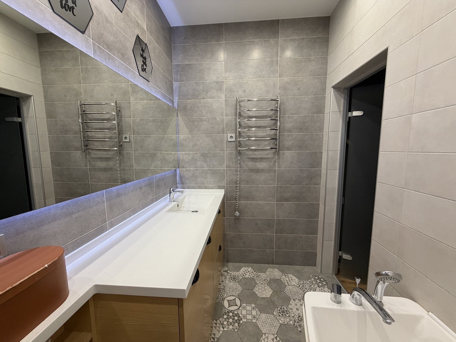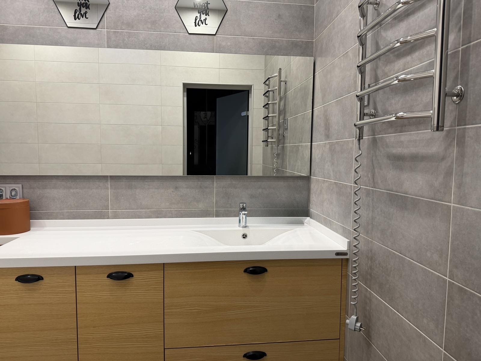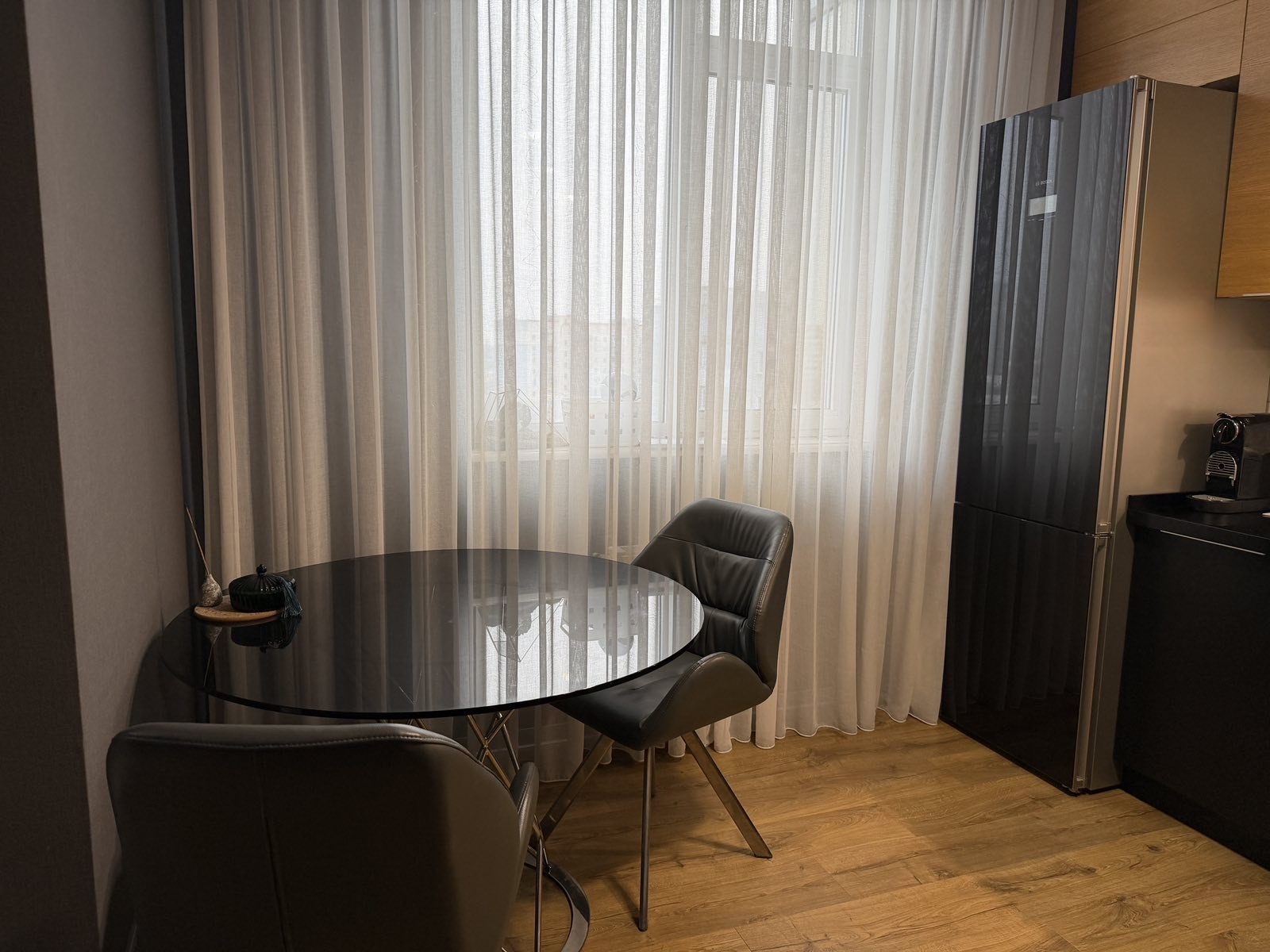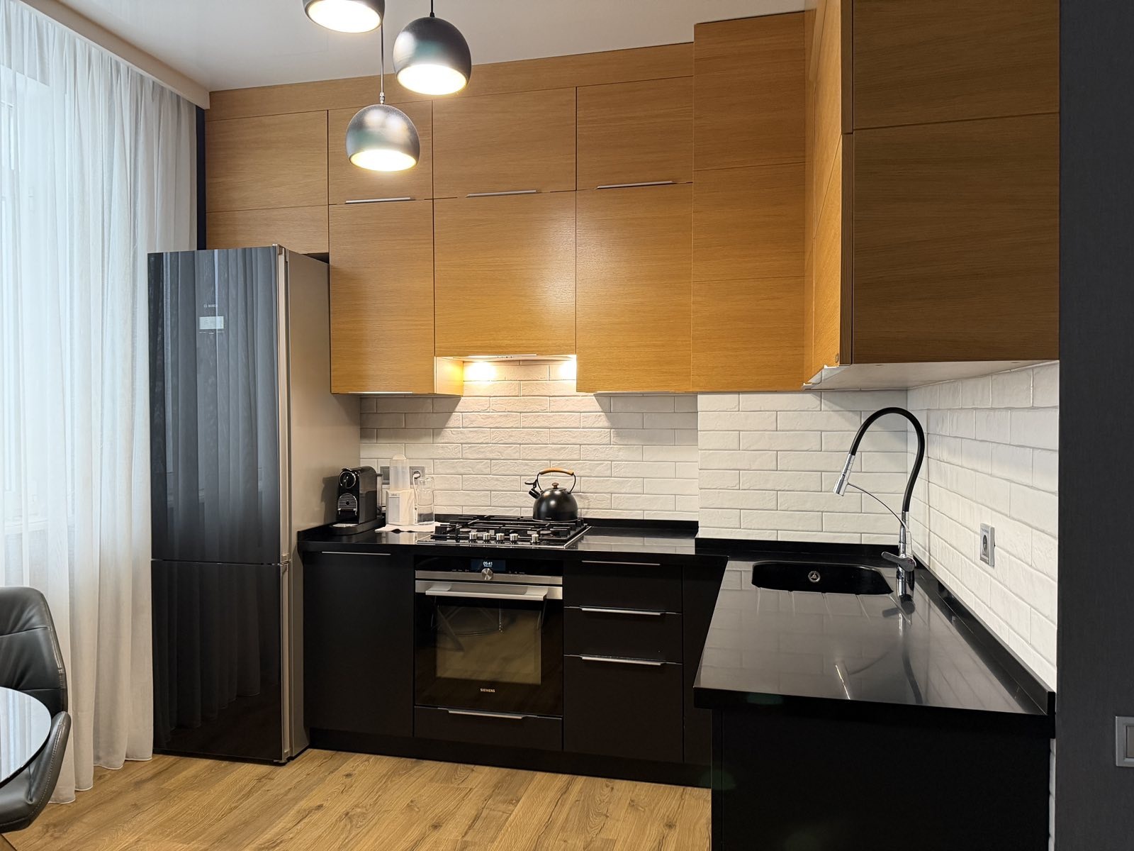 Квартира повністю укомплектована якісними меблями Domani з МДФ та натурального шпону, мякі меблі Softali, уся необхідна техніка — пральна машина, сушильна машина, посудомийна машина, духова шафа з функцією СВЧ, телевізор, холодильник.